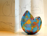 Hafner would create the painstakingly intricate flat glass compositions, or "mosaics", as she calls them. Tagliapietra would then be brought in to create the bubbles for "roll-up", and then shape them to Hafner's exacting models and designs. |